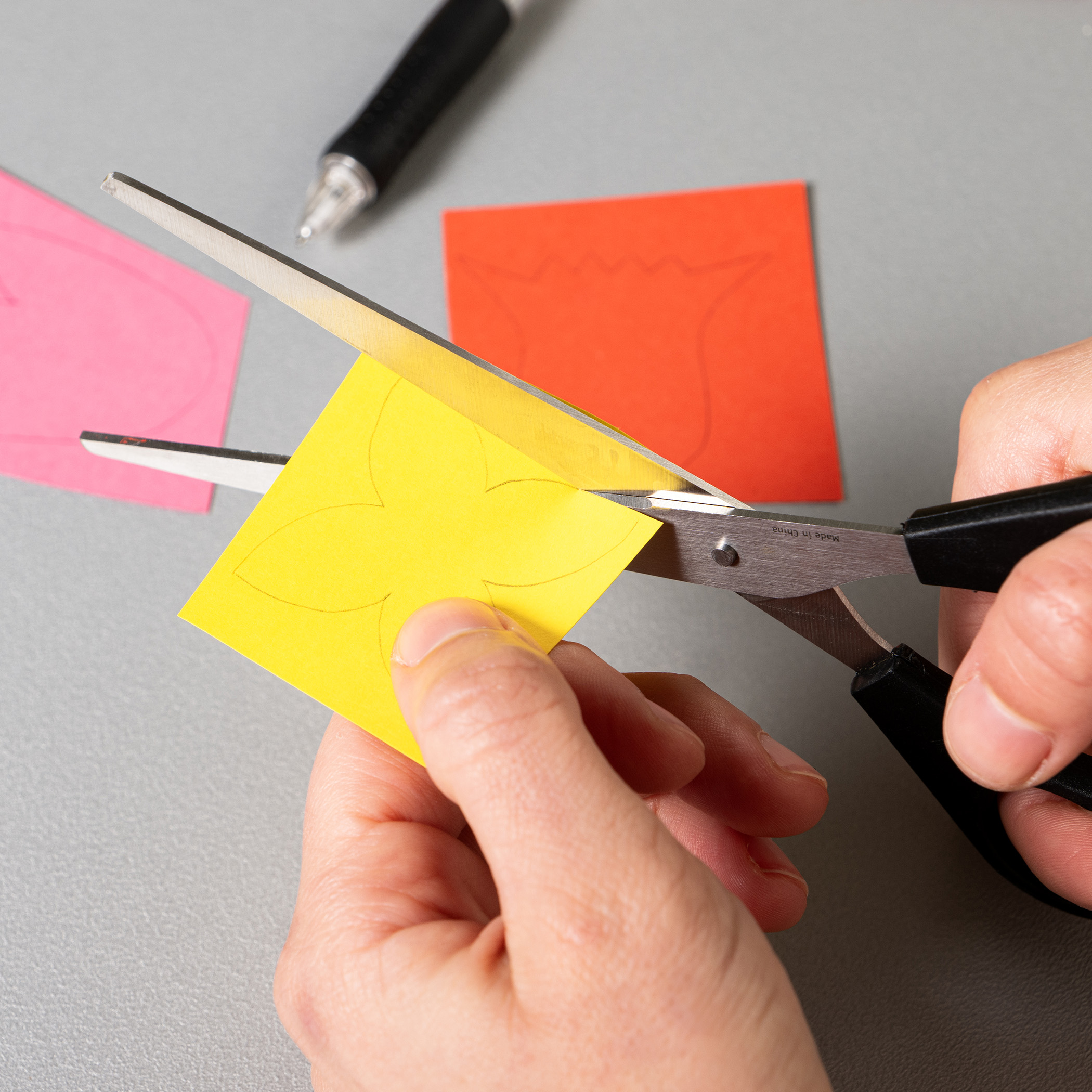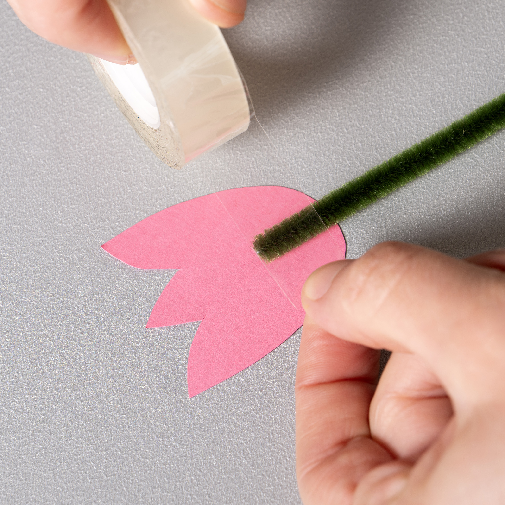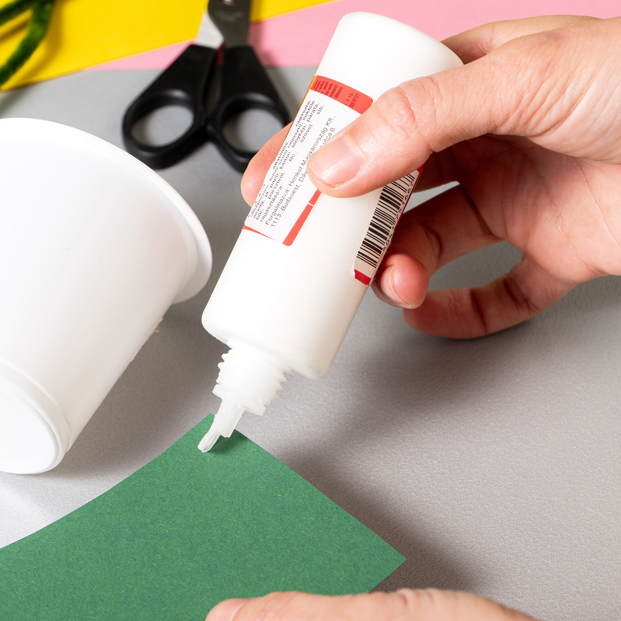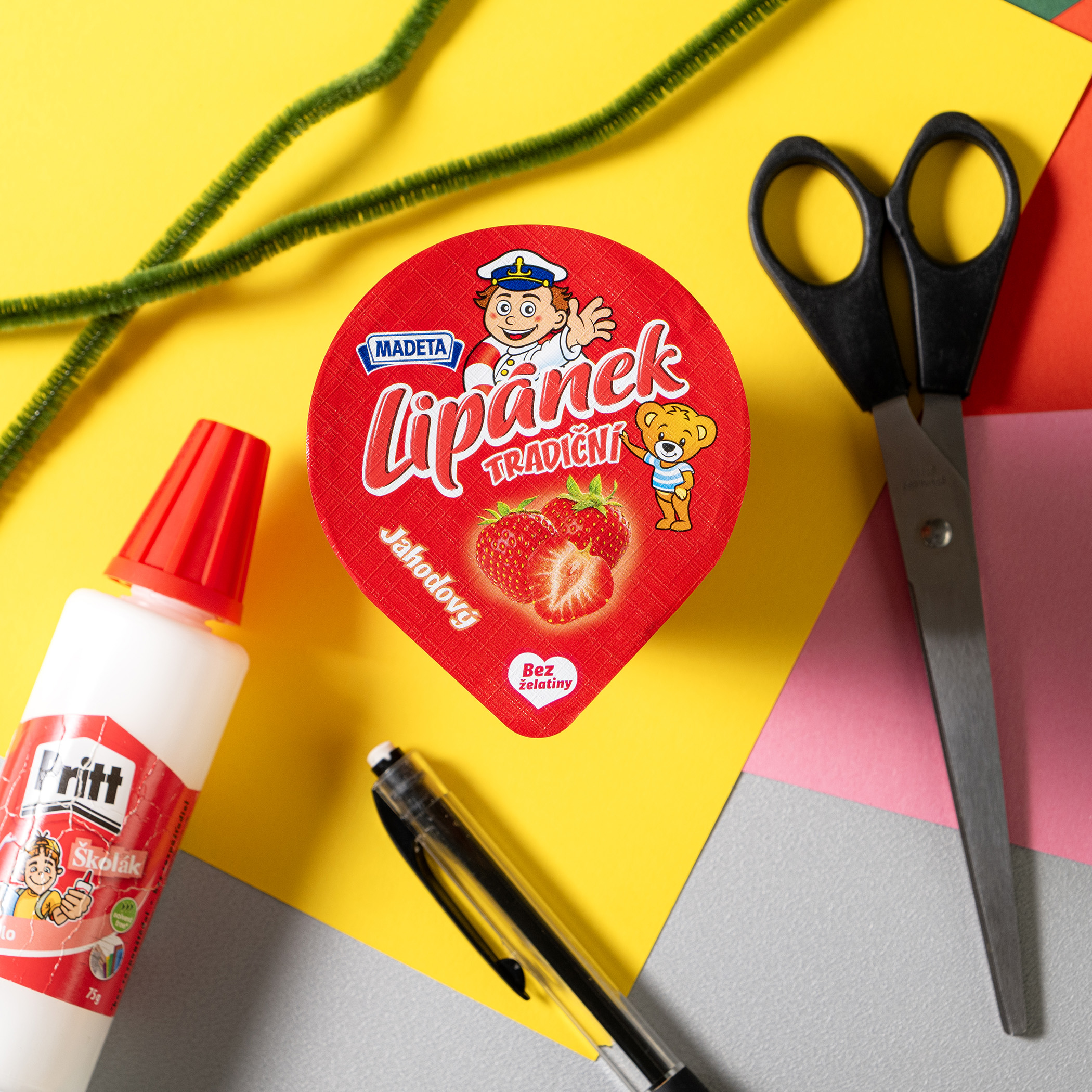 Téglik dôkladne vymyjeme a zložíme z neho papierový obal. Zo zeleného papiera vystrihneme pás o veľkosti obvodu téglika a nalepíme ho na téglik. Z ružového, červeného a žltého papiera vystrihneme rôzne tvary kvetov. Nalepíme na ne plyšový drôtik a izolepú pripevníme do vnútra téglika.