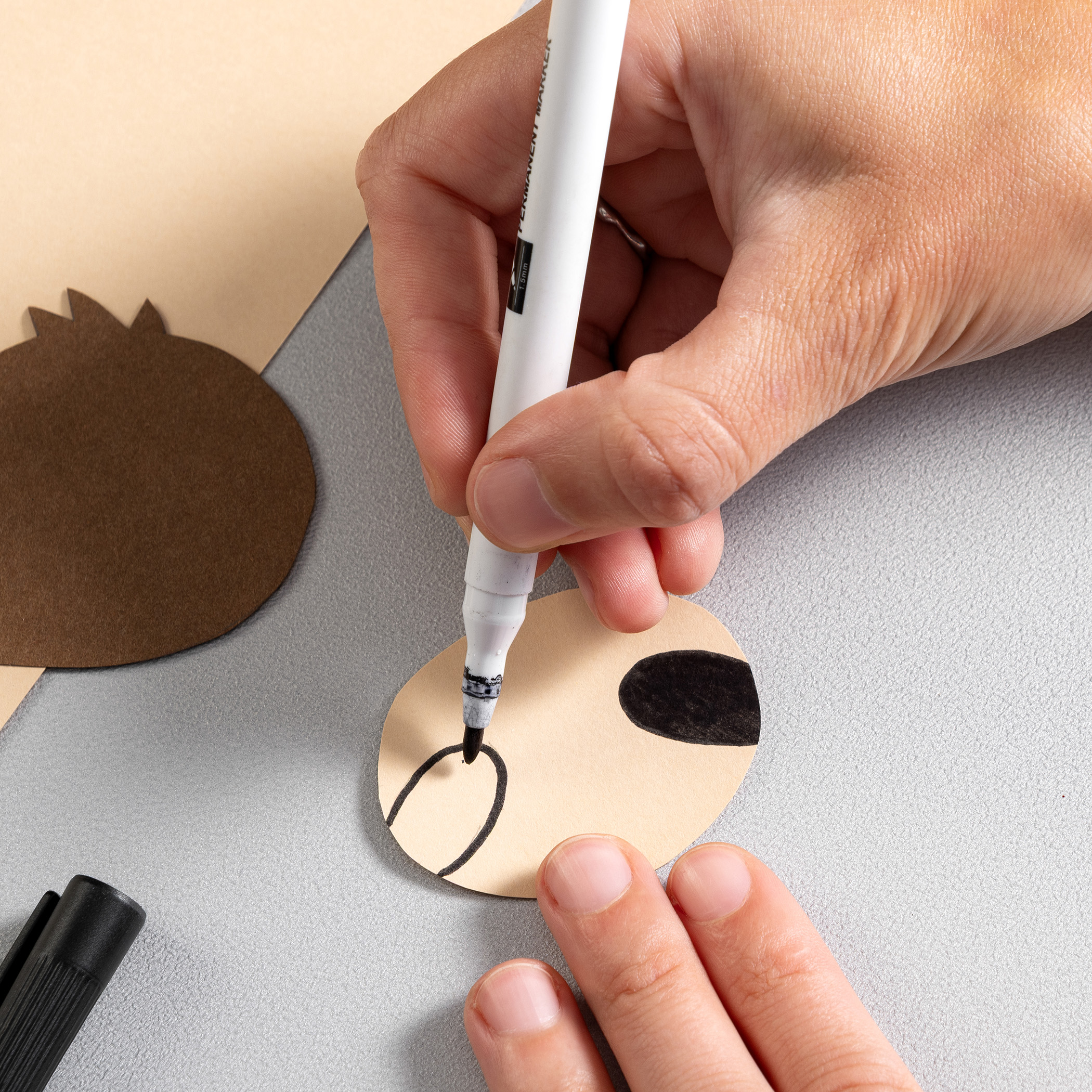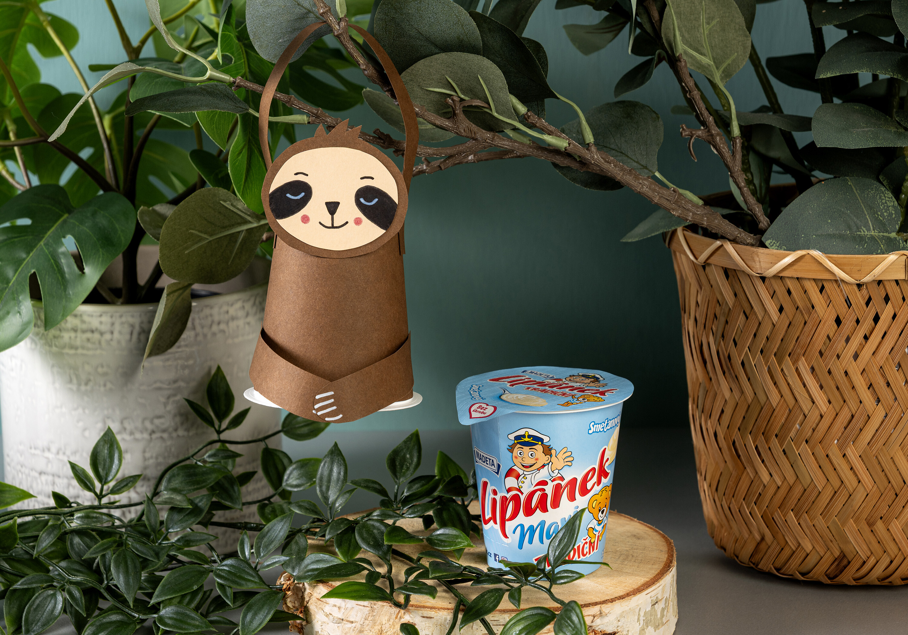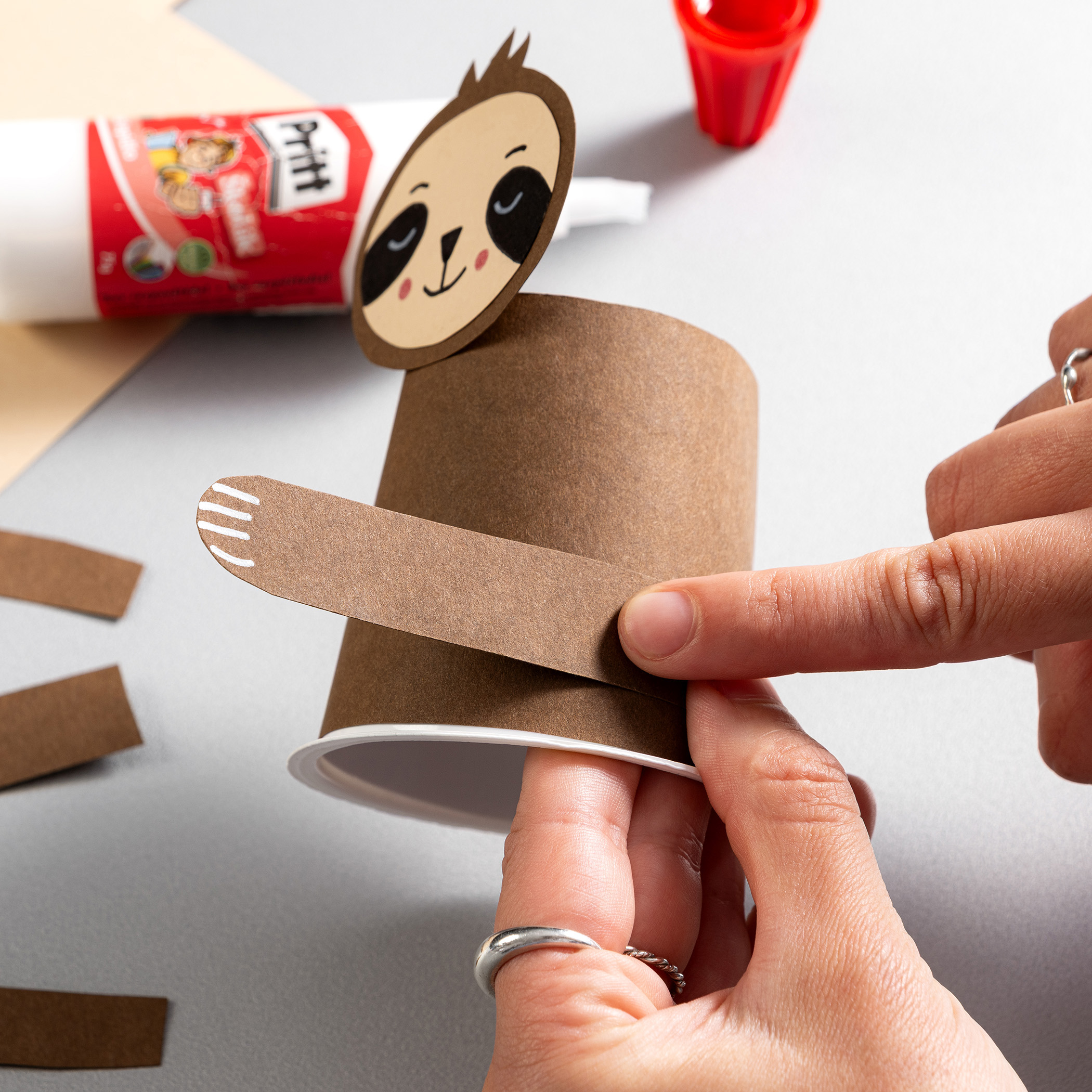 Téglik dôkladne vymyjeme a zložíme z neho papierový obal. Z hnedého papiera vystrihneme pás o veľkosti obvodu téglika a nalepíme ho na téglik. Ďalej z nej vystrihneme hlavu a 4 prúžky na ruky a nohy. Z okrového papiera vystrihneme ovál a nalepíme ho na hlavu. Fixy a pastelkou dokreslíme tvár. Bielou fixkou nakreslíme pazúriky a ruky aj nohy nalepíme na téglik.