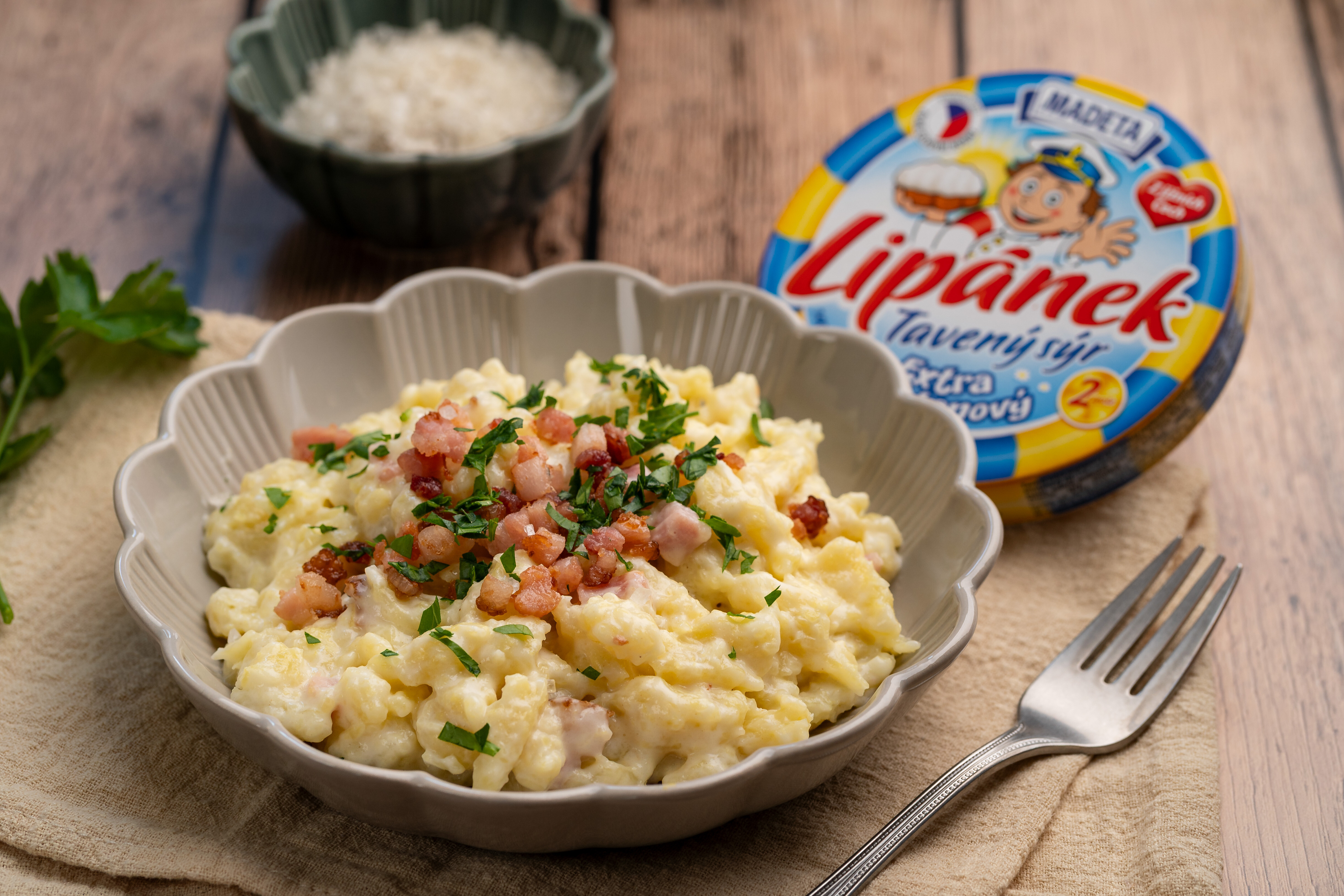 Medzitým si v menšom hrnci do zlatista opečieme na kocky nakrájanú slaninu alebo špek. Do ešte teplých halušiek vmiešame celý Lipánek topený syr smotanový - krásne sa rozpustí a halušky jemne obalí.