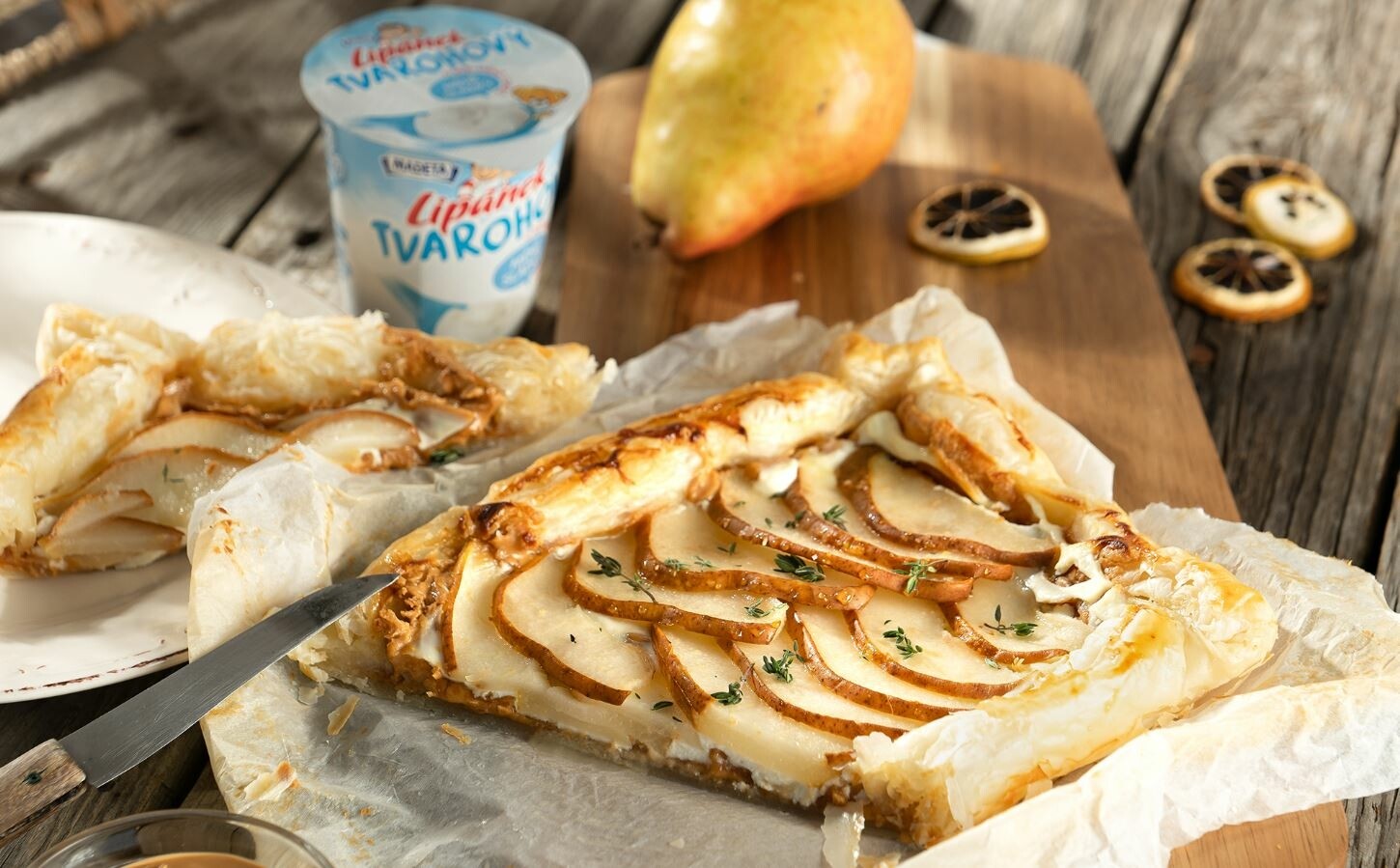 Hruškový koláč z lístkového cesta s arašídovým maslom a Tvarohovým Lipánkom
