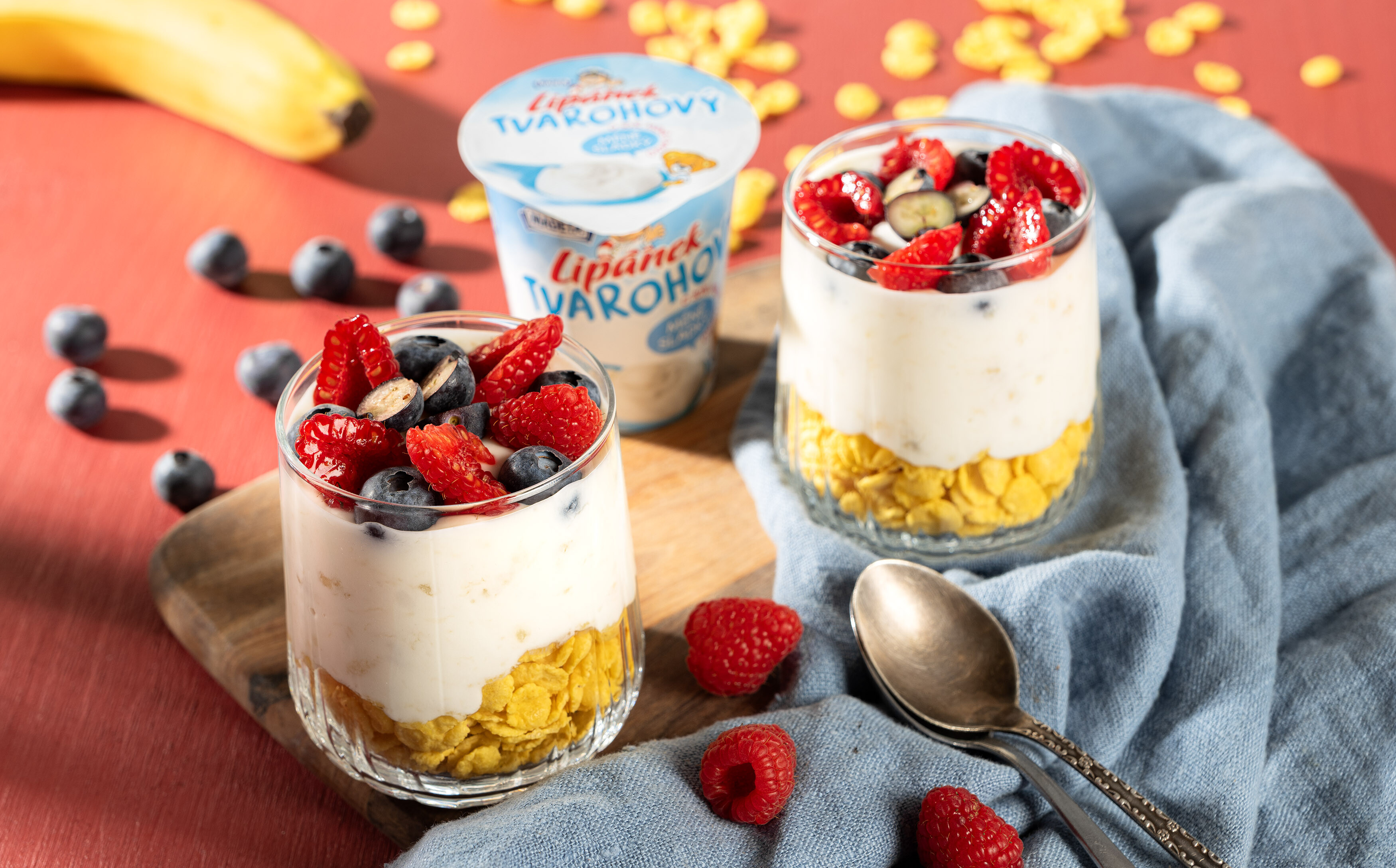 Tvarohového Lipánka vymiešame s bielym jogurtom dohladka. Banán roztlačíme a vmiešame do zmesi. Podľa chuti prípadne zmes dosladíme medom. Do pohárov nasypeme ovsené vločky či lupienky a pridáme vrstvu Lipánka. Navrch dáme ovocie. Podľa chuti vrstvy opakujeme.