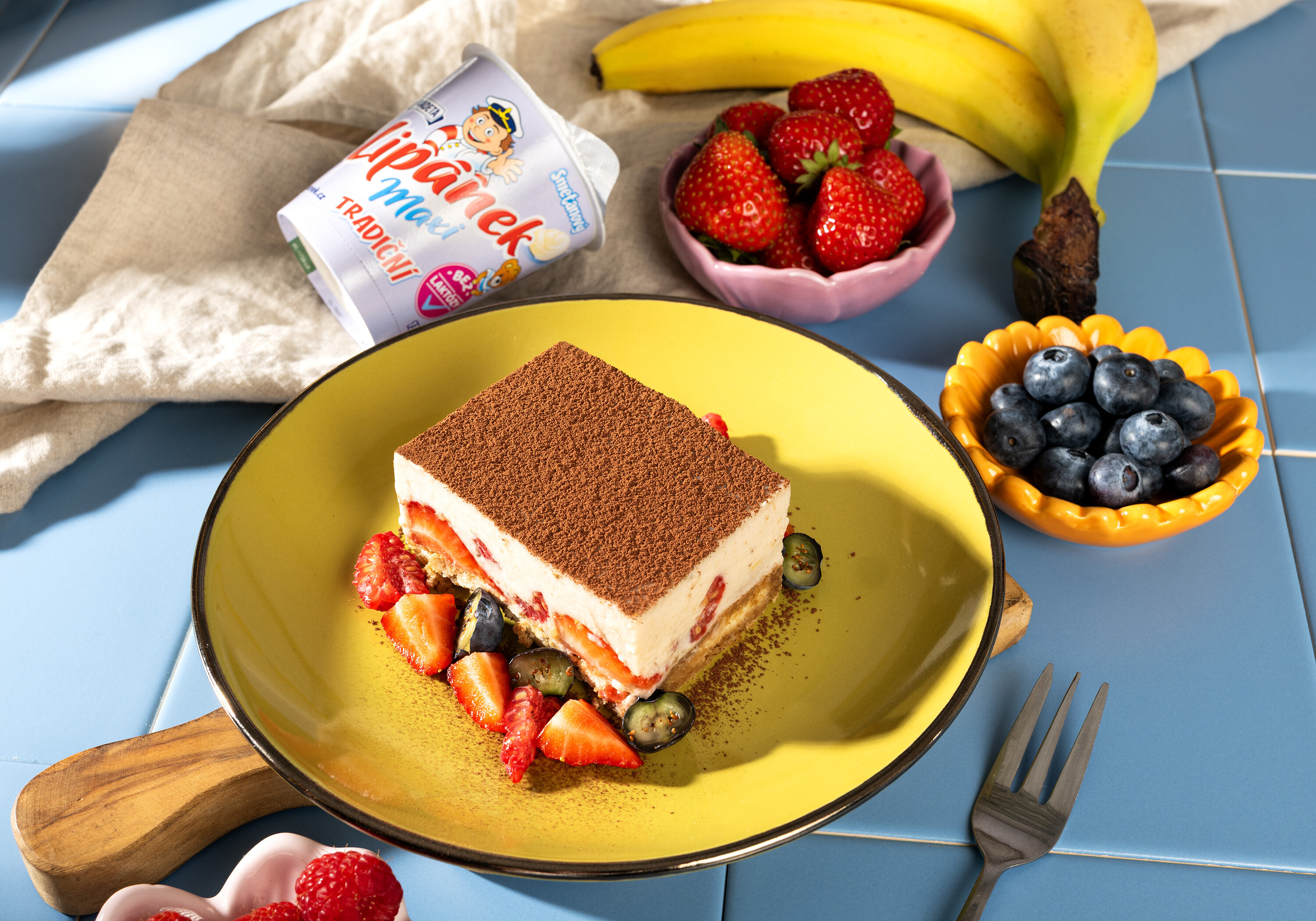 Na dno menšej formy rozložíme piškóty namočené v káve bez kofeínu, aby bolo celé dno pokryté. V mise zmiešame Lipánek bez laktózy, práškový cukor, vanilkovú pastu a stužovač. Na piškóty rozložíme pripravené ovocie. Opatrne zalejeme zmesou s Lipánkom a necháme stuhnúť v chladničke na cca 2 hodiny. Po stuhnutí posypeme kakaom a ozdobíme zvyšným ovocím.