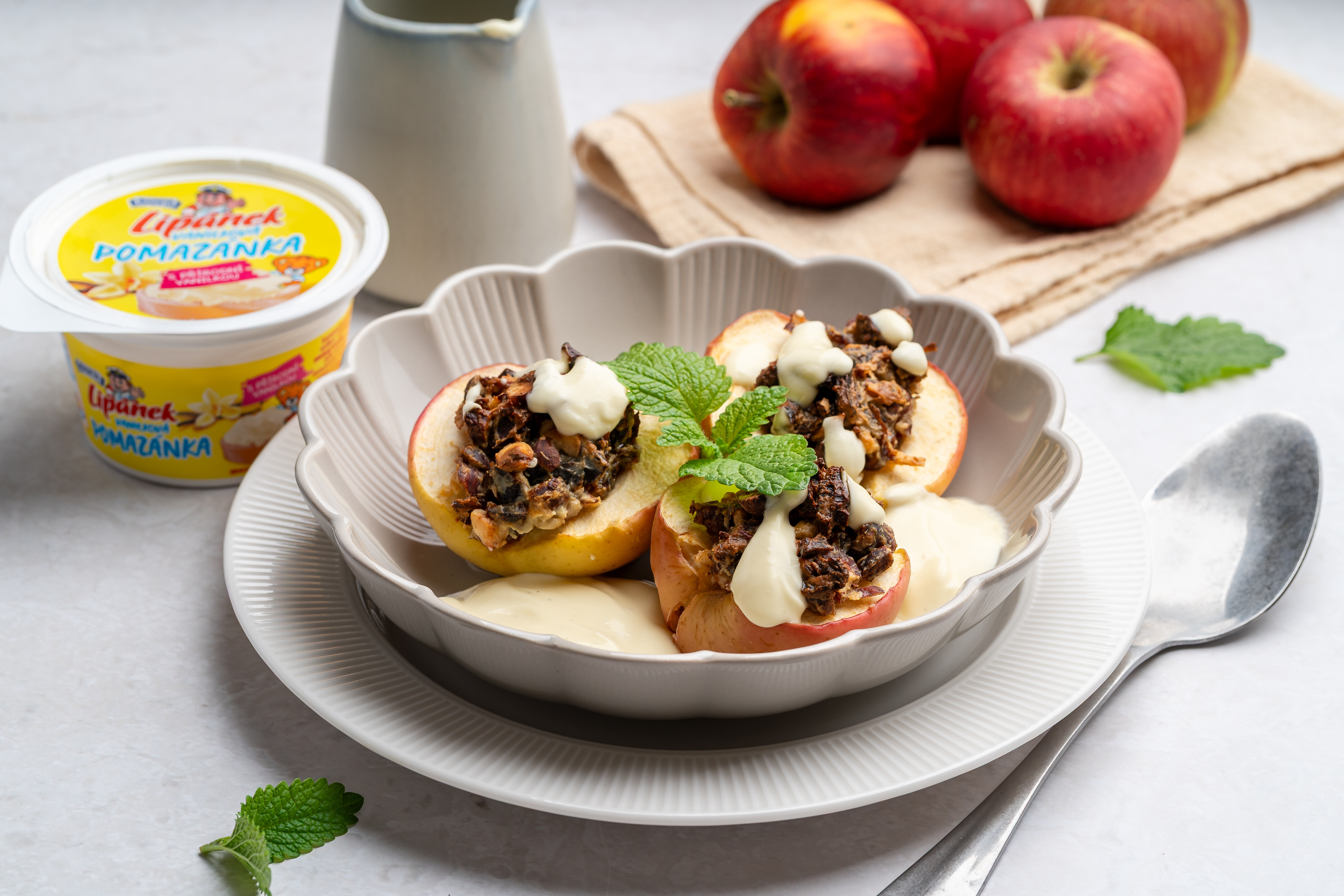 Datle a orechy nasekáme najemno. Zmiešame ich s vanilkovou nátierkou Lipánek, škoricou a kardamónom. Vzniknutou zmesou naplníme jablká a poukladáme ich do menšej zapekacej misky.
