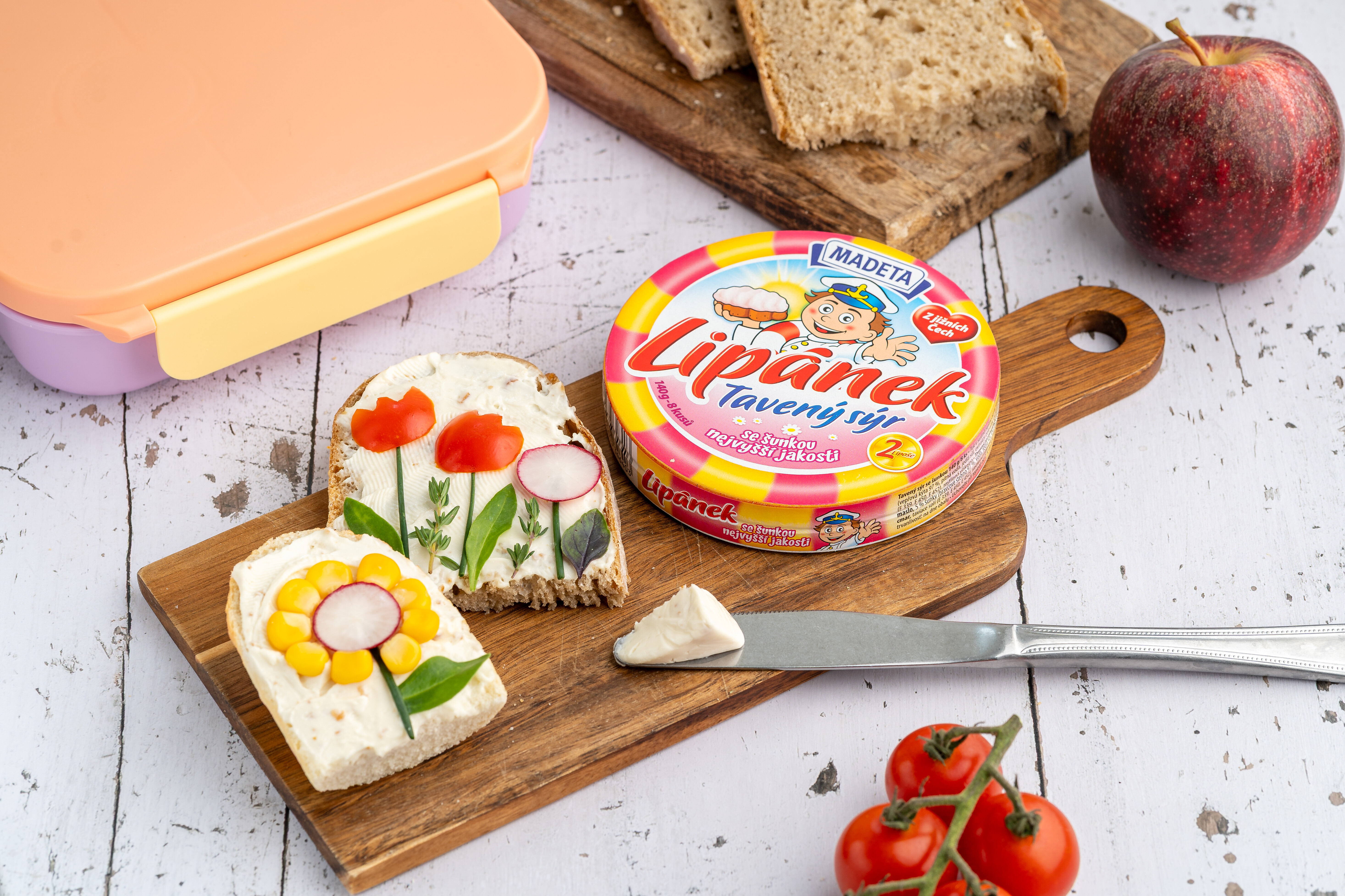 Chlieb alebo bagetku natrieme topeným syrom Lipánek. Zo zeleniny a byliniek tvoríme kvietky. Stonky urobíme z pažítky, lístky zo špenátu alebo listov byliniek. Cherry paradajky rozkrojíme v tretine a nožom ich vytvarujeme do tulipánu. Ďalšia kvetinka môže byť z plátku redkvičky, ku ktorej môžeme pridať dookola kukuricu.